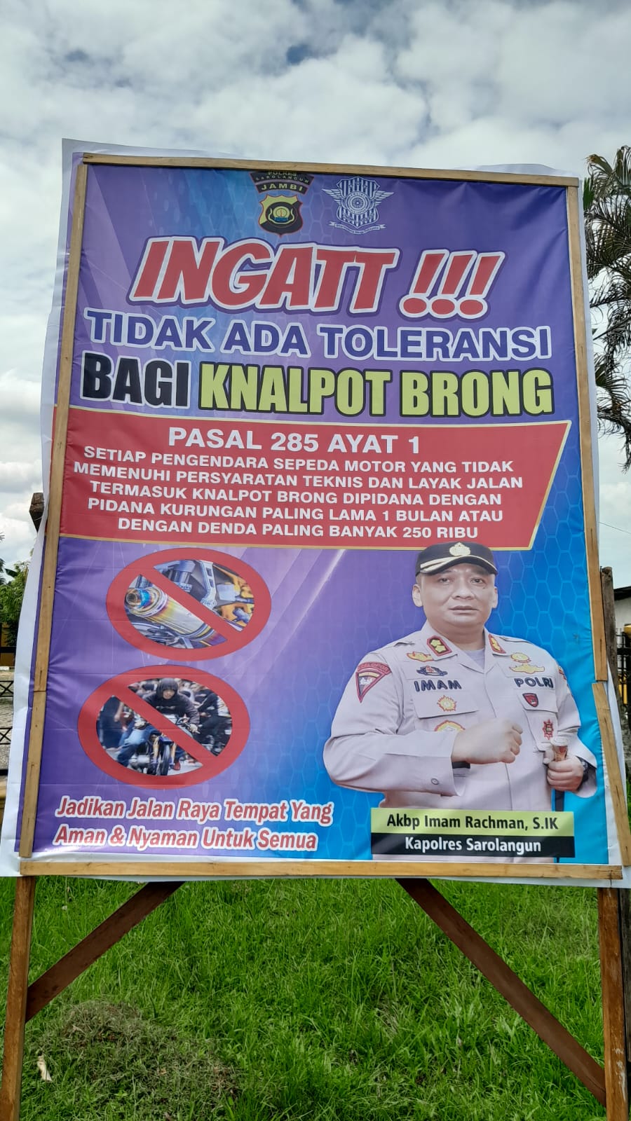 Himbauan yang dibuat oleh Sat Lantas Polres Sarolangun berisi ajakan agar masyarakat tidak menggunakan knalpot brong serta tidak melakukan aksi balap liar, Sat Lantas tidak memberikan toleransi bagi pengguna knalpot Brong dan para pelaku balap liar, hal tersebut merupakan pelanggaran lalu lintas sesuai pasal 285 Ayat (1) Undang Undang No 22 Tahun 2009 tentang Lalulintas dan Angkutan Jalan, dimana disebutkan “Setiap Pengendara Sepeda Motor Yang Tidak Memenuhi Persyaratan Teknis dan Layak Jalan Termasuk Knalpot Brong dipidana dengan Pidana kurungan paling lama 1 Bulan atau dengan denda paling banyak 250 ribu”