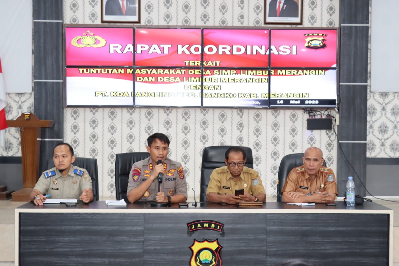 Bertempat di Aula Wirasatya Polres Merangin pukul 10:00 wib,Rapat Koordinasi di pimpin Akbp. Dewa Ngakan Nyoman Arinata. S.IK.,M.H Kapolres Merangin ” peristiwa masa lalu dan kita petakan lagi berupa persiapan Dokumen dokumen dalam penyelesaian Sengketa ini,point’ Ucap Kapolres saat koordinasi pada warga.