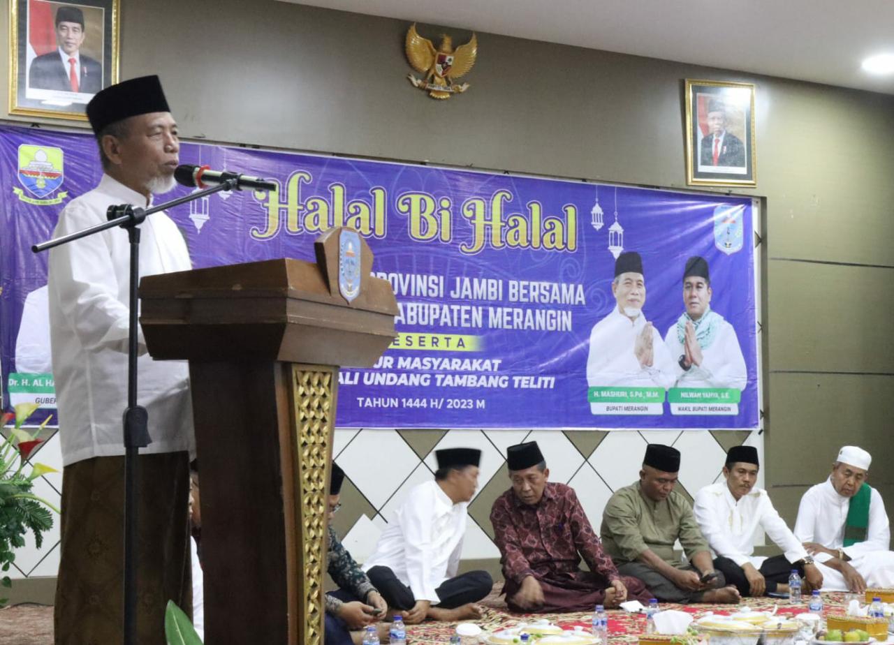 Dinastinews.com. Bangko-Pemkab Merangin menggelar Halal Bihalal Hari Raya Idul Fitri 1444 H bersama Pemerintah Provinsi Jambi, di Auditorium rumah dinas bupati Merangin, Sabtu malam (20/5).