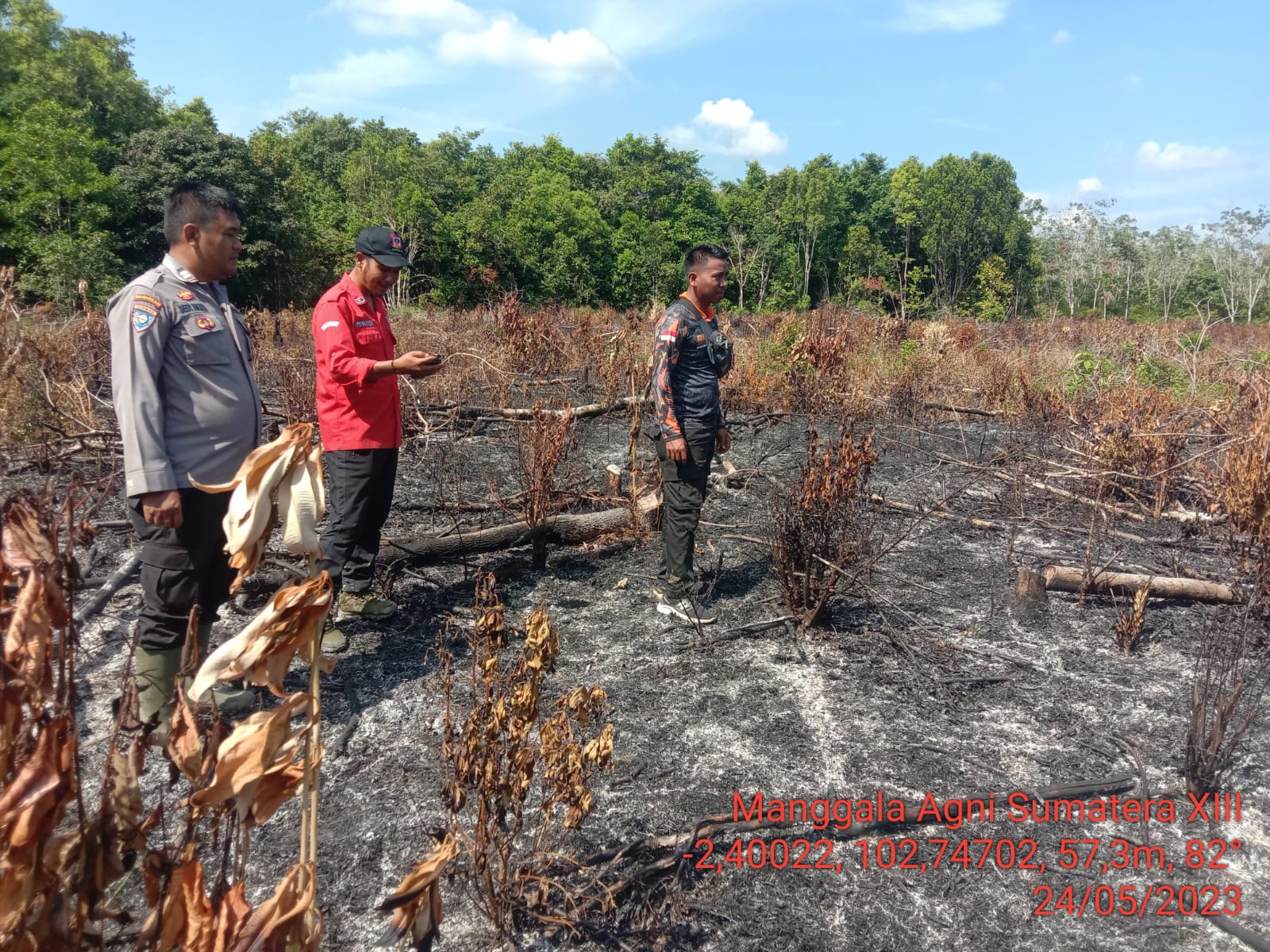 “Begitu mendapat laporan adanya titik api, Anggota kita bersama rekan dari TNI, Manggala Agni dan BPBD langsung menuju kedua lokasi titik api, sesampainya di lokasi titik Hotspo, Tim menemukan lahan yang sudah terbakar sehingga dilakukan pengambilan data di area yang sudah terbakar yang merupakan pohon karet dan anak sawit, di Desa desa lidung lahan yang terbakar seluas ± 0,5 Ha sedangkan di desa bukit seluas ± 3 Ha pemilik lahan tidak diketahui” Ujar kabag Ops.