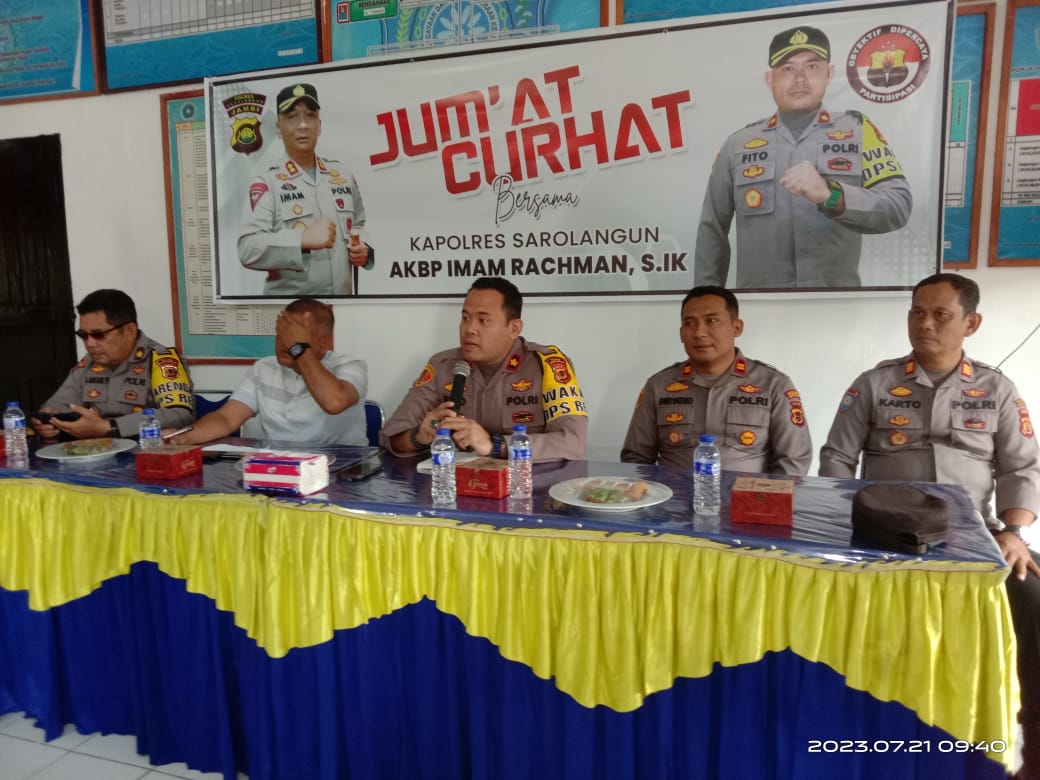 Jum’at (21/7/2023) Pukul 09.15 Wib Polres Sarolangun laksanakan kegiatan Jumat Curhat Bersama Kapolres Sarolangun dan Waka Polres Sarolangun bertempat di Kantor Lurah Pasar Sarolangun Kec.Sarolangun, Warga Kelurahan Pasar keluhkan masalah narkoba, curanmor, lakalantas, data pribadi bocor.