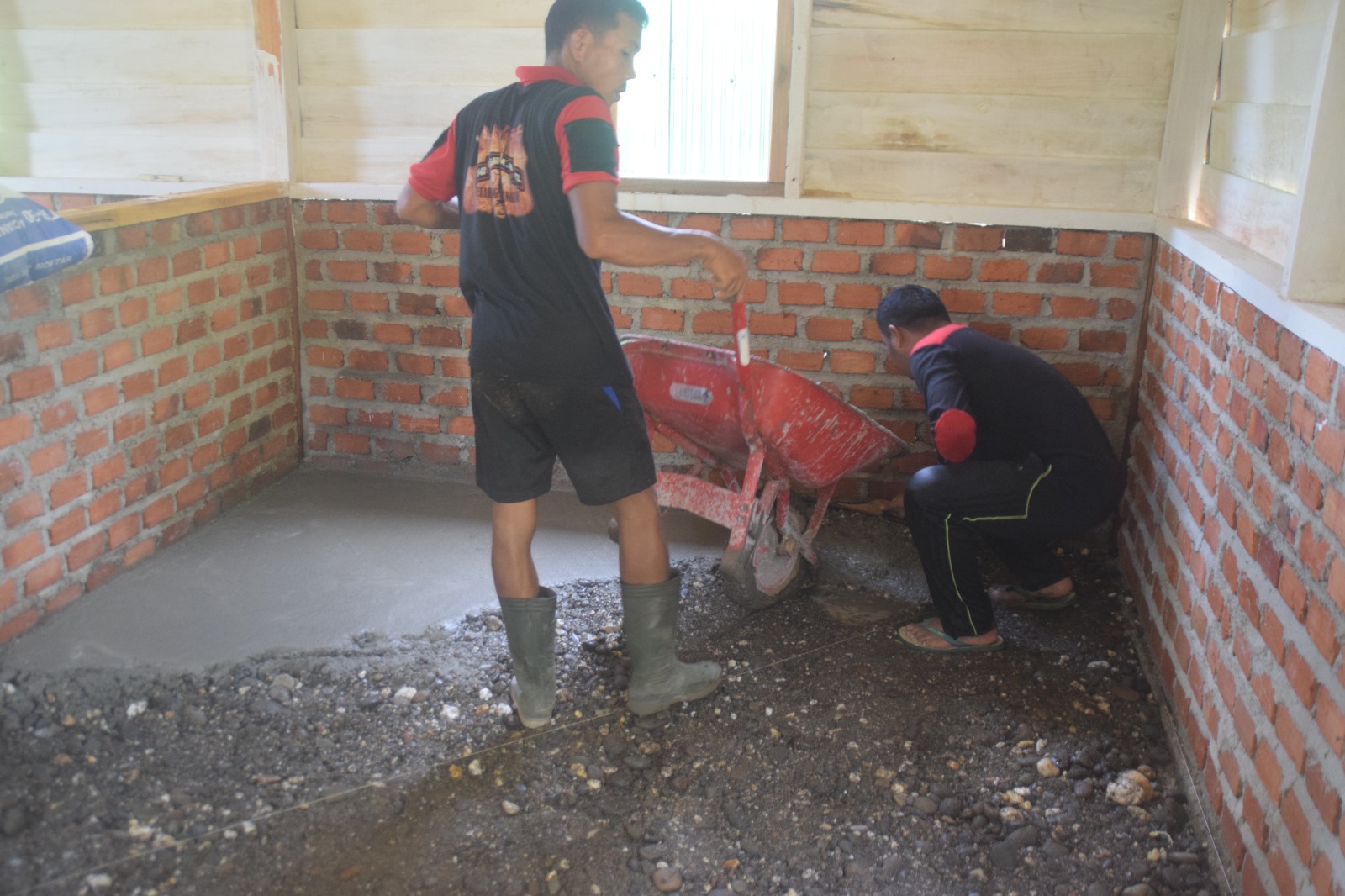 Dikoordinir oleh Lettu Inf Limbong, Satgas TMMD ke 122 Kodim 0420 Sarko bersama warga setempat melanjutkan pekerjaan melantai semen di rumah Yabani.