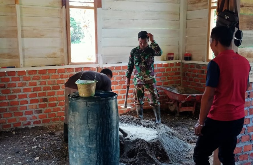 Merangin – Dalam rangka program TNI Manunggal Membangun Desa (TMMD) ke-122, anggota Satgas TMMD ke 122 Kodim 0420 Sarko melaksanakan kegiatan pengecoran lantai rumah Yabani warga Desa Bedeng Rejo, Kecamatan Bangko Barat.