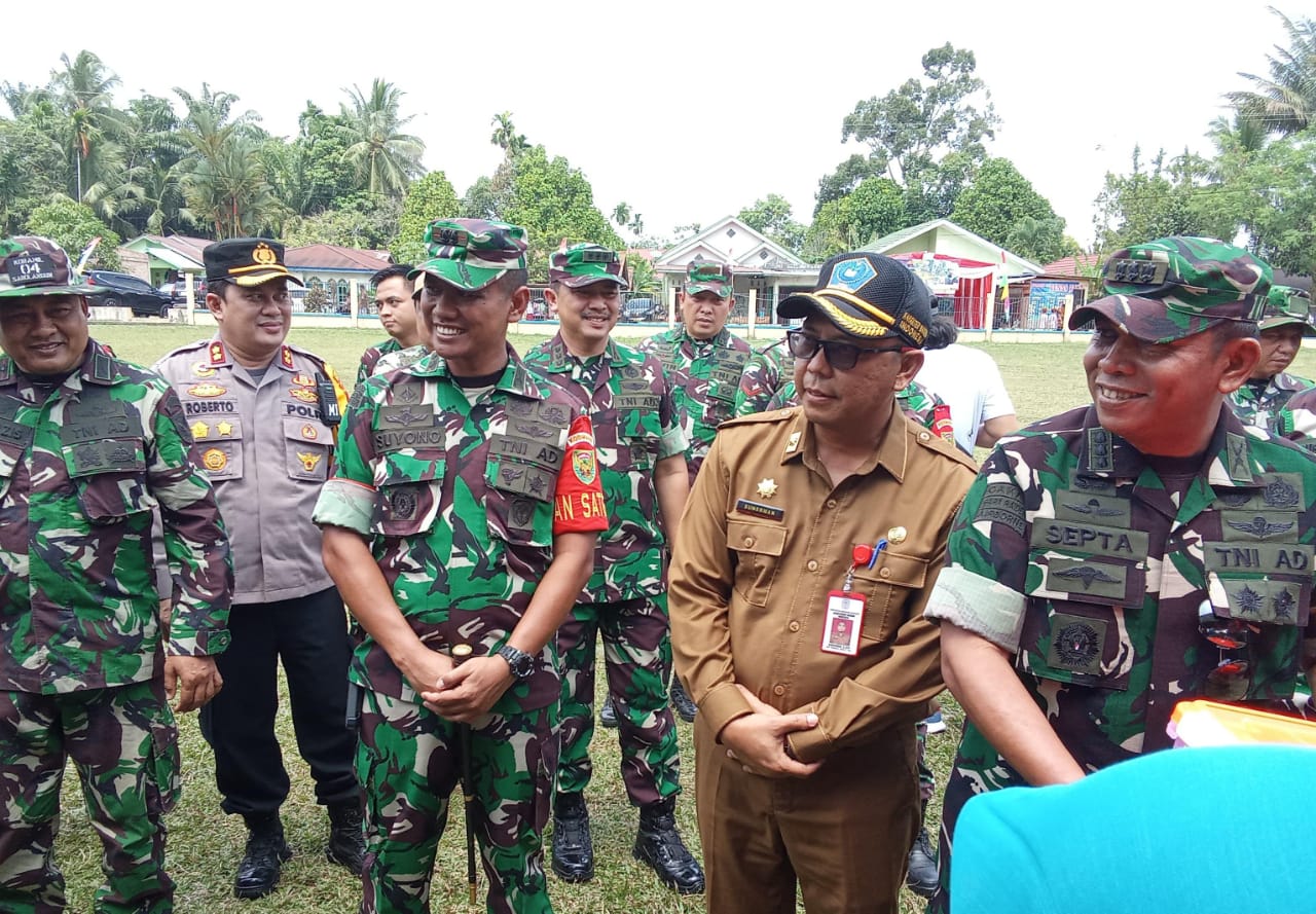Kunjungan Kolonel Inf Septa Viandi Dwi P disambut Pj Bupati Merangin Jangcik Mohza diwakili Asisten II Setda Merangin Suherman, bersama Dandim 0420/Sarko Letkol Inf Suyono beserta Kasdim Mayor Inf Usman dan Kapolres Merangin AKBP. Ruri Roberto, di halaman Posko TMMD Lapangan Bola Desa Bedeng Rejo.