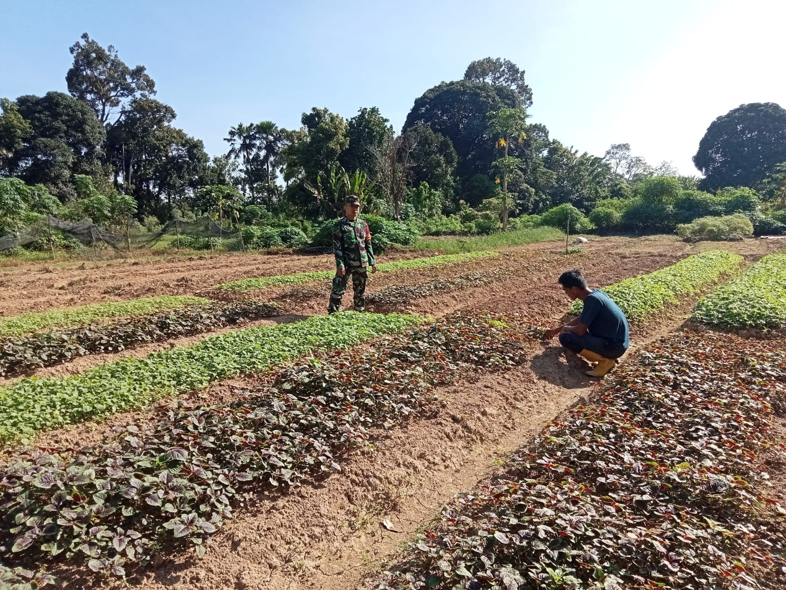 Babinsa Bantu Petani Rawat Tanaman Bayam Di Desa Binaan