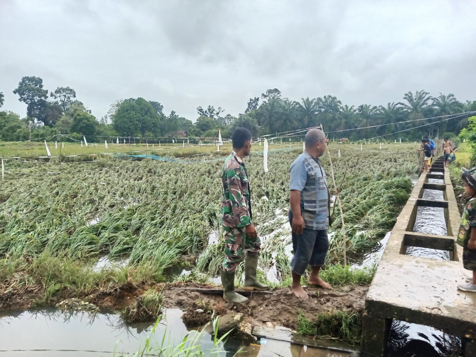 Serda M. Deni Bersama Lurah, Wakil Ketua LPM, dan Ketua Poktan Pantau Sawah Terdampak Banjir di Poktan Rantau Bayur