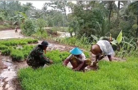 Pada kesempatan tersebut, Babinsa tak segan untuk terjun langsung ke sawah, membantu para petani untuk mengumpulkan bibit padi yang siap untuk ditanam di lahan milik warga.