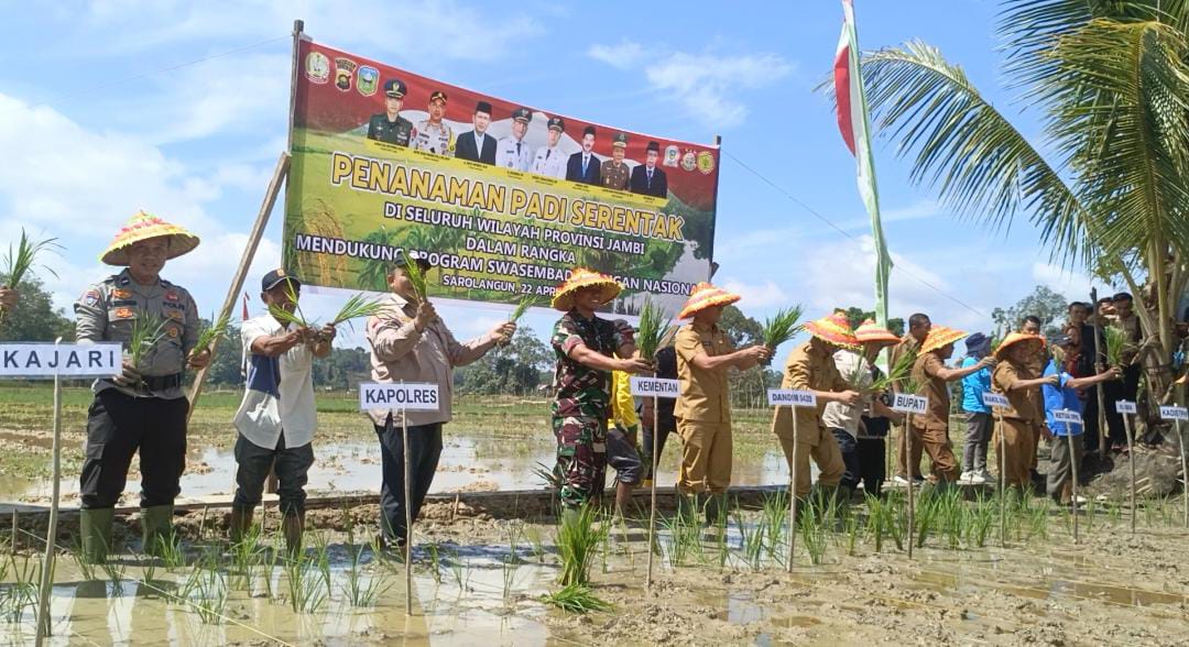 DNC. Sarolangun-Jambi. 22 April 2025 – Komandan Kodim 0420/Sarko Letkol Inf Suyono, S.Sos menghadiri kegiatan Zoom Meeting bersama Gubernur Jambi Drs. H. Al Haris, S.Sos., M.H, dan Danrem 042/Gapu Jambi Brigjen TNI Heri Purwanto, SE., M.Sc, dalam rangka Penanaman Padi Sawah Serentak Kabupaten/Kota se-Provinsi Jambi, yang dirangkaikan langsung dengan kegiatan penanaman padi serentak se-Provinsi Jambi, di Kabupaten Sarolangun. Acara yang dimulai pada pukul 09.00 WIB ini dipusatkan di lahan pertanian milik Kelompok Tani (Poktan) Selang Rengas, Dusun Pulau Pinang, Kelurahan Sarkam, Kabupaten Sarolangun. Kegiatan ini salah satu upaya untuk meningkatkan produktivitas pertanian dan memperkuat ketahanan pangan di Provinsi Jambi. Acara diawali dengan pembukaan dan pelaksanaan Zoom Meeting yang terhubung langsung dengan Bapak Gubernur Jambi, Danrem Jambi, serta para kepala daerah se-Provinsi Jambi. Dalam pertemuan virtual tersebut, para peserta menyanyikan lagu kebangsaan Indonesia Raya, dilanjutkan dengan sambutan dari Gubernur Jambi, yang menekankan pentingnya sinergi dalam mendorong ketahanan pangan di tingkat daerah.