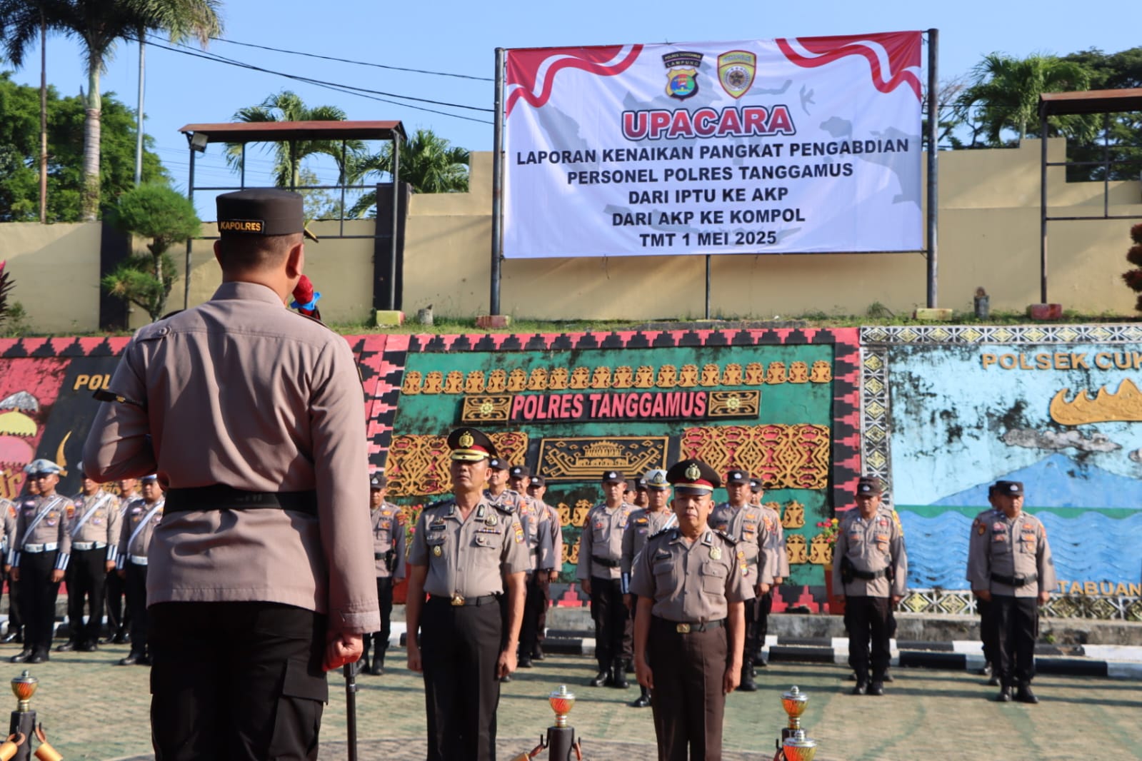 DinastiNews.Com | Tanggamus – Kapolres Tanggamus AKBP Rahmad Sujatmiko, S.I.K., M.H., memimpin langsung upacara laporan kenaikan pangkat pengabdian dua personel Polres Tanggamus, yang berlangsung khidmat di halaman Mapolres, Rabu (30/4/2025).
