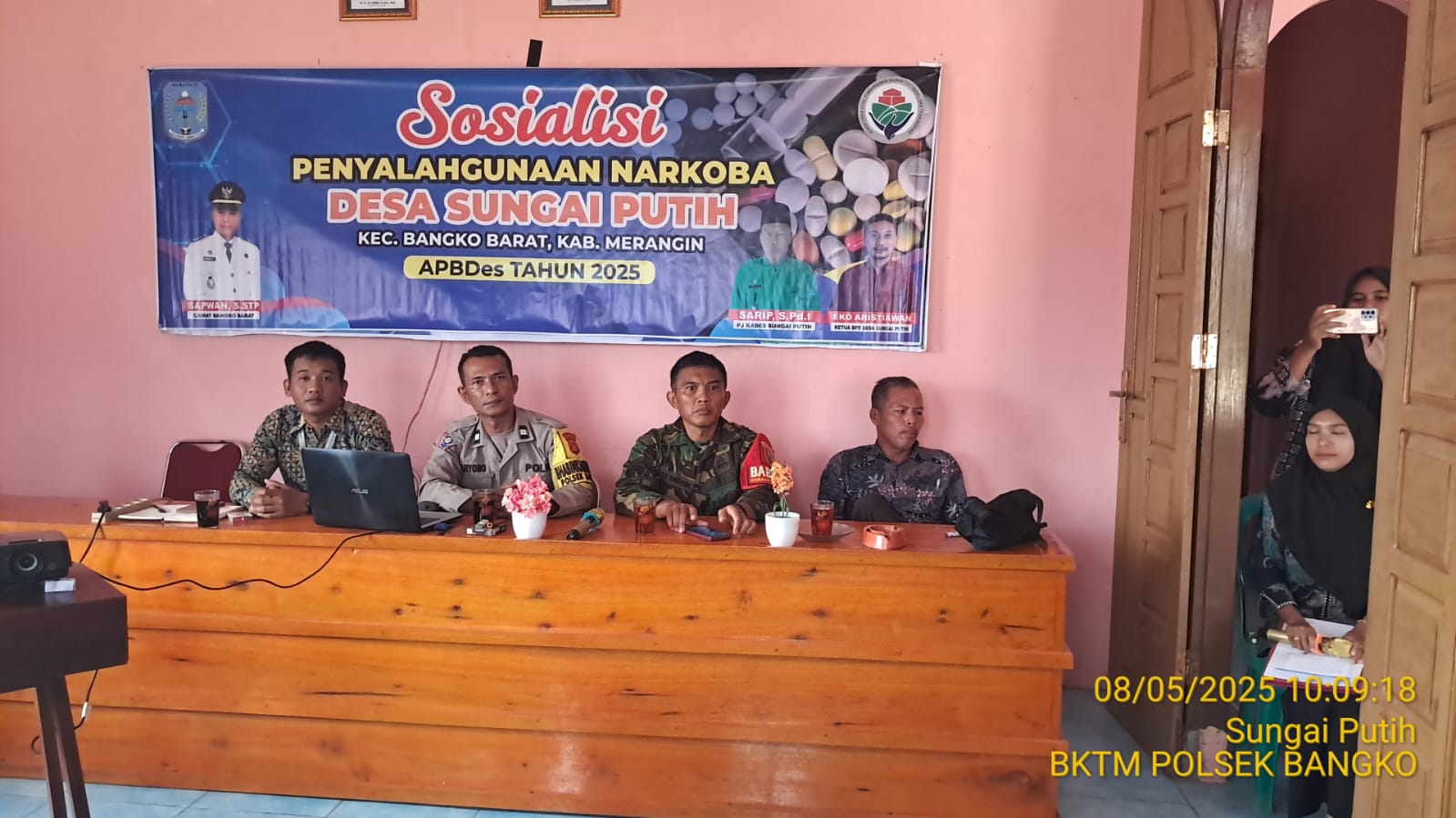 Merangin – Jambi. Polres Merangin melalui Bhabinkamtibmasnya mengingatkan warganya mengenai bahaya penyalahgunaan narkoba dan judi online. Kegiatan tersebut dilaksanakan pada Kamis (08/05/2025) sekira pukul 09.00 Wib di Aula Kantor Desa Sungai Putih Kec. Bangko Barat Kab. Merangin.