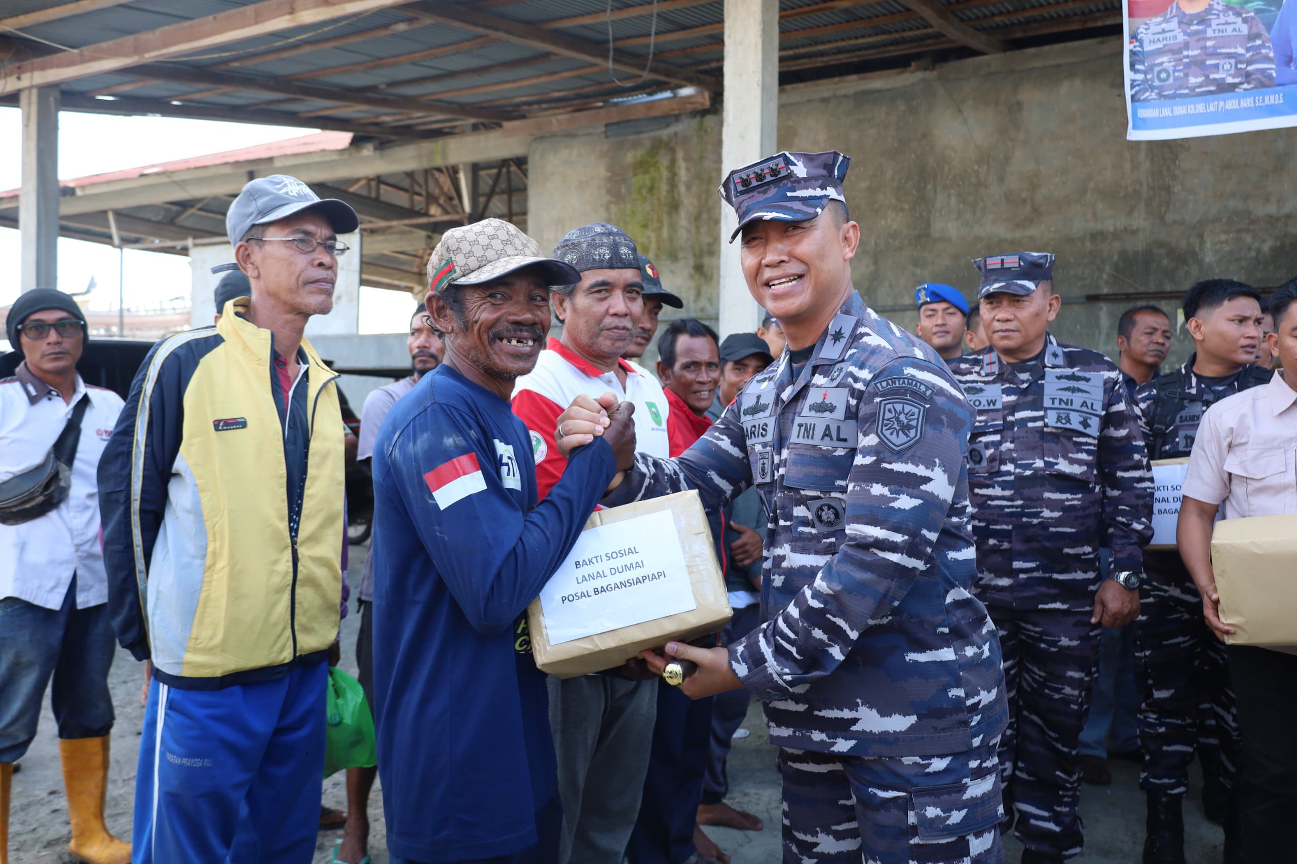 DinastiNews.com Dumai — Pangkalan TNI Angkatan Laut Dumai kembali menunjukkan kepedulian terhadap masyarakat nelayan dengan melaksanakan bakti sosial, bertempat di Pelabuhan Oliong Bagan Siapi-api Rokan Hilir Riau. Bersama Bupati Rokan Hilir H. Bistamam dan Instalasi Maritim Rokan Hilir, Danlanal Dumai Kolonel Laut (P) Abdul Haris membagikan paket sembako kepada masyarakat nelayan di Bagan Siapi-api, Sabtu (10/5/2025).