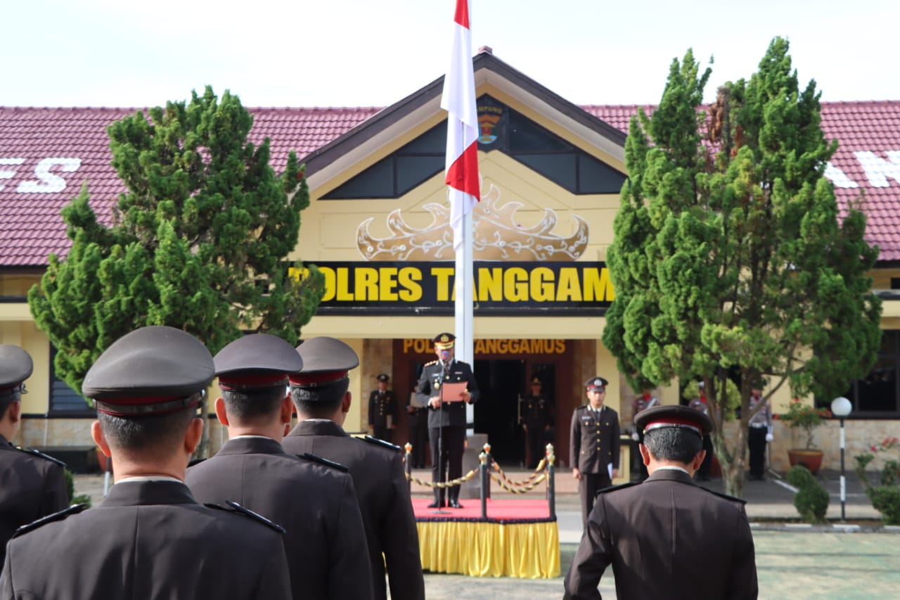 Kapolres Tanggamus, AKBP Rahmad Sujatmiko, S.I.K., M.H., bertindak sebagai inspektur upacara dan Komandan Upacara Ipda Febran Kurniawan, S.H., sementara pembacaan pembukaan UUD-1945 oleh Ipda Agung Irawan, S.H., M.H.