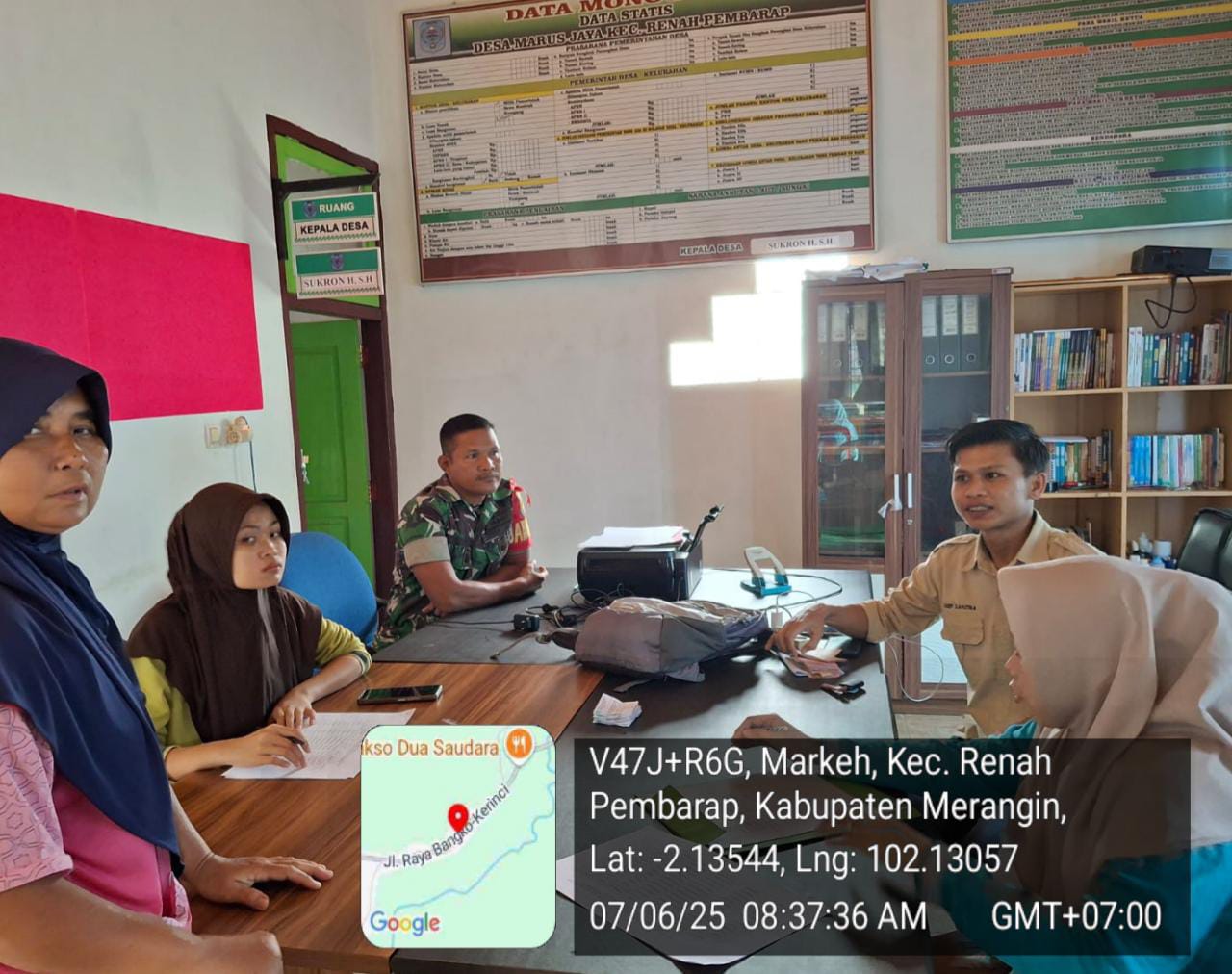 Babinsa Koramil 420-07/Sei Manau Serda Eko ediyanto melaksanakan Komunikasi Sosial (Komsos) dalam rangka Pembinaan Teritorial dengan masyarakt Desa Marus Jaya Kec, Renah pembarap Kabupaten Merangin.(07/06/2025)