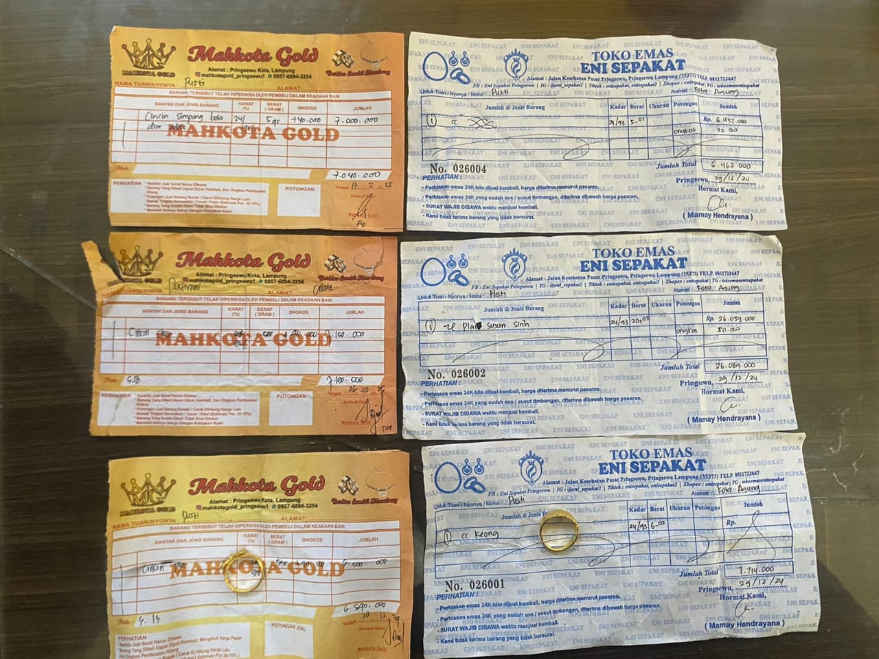 Barang bukti yang diamankan polisi cukup beragam, mulai dari beberapa perhiasan emas seperti cincin, gelang, kalung dengan total berat belasan gram, nota pembelian emas, uang tunai Rp10,9 juta, handphone berbagai merk, hingga perlengkapan seperti dirigen air emas, tabung skomper bensin, selang, mangkuk emas (koi), blencong, dan celengan tabung.
