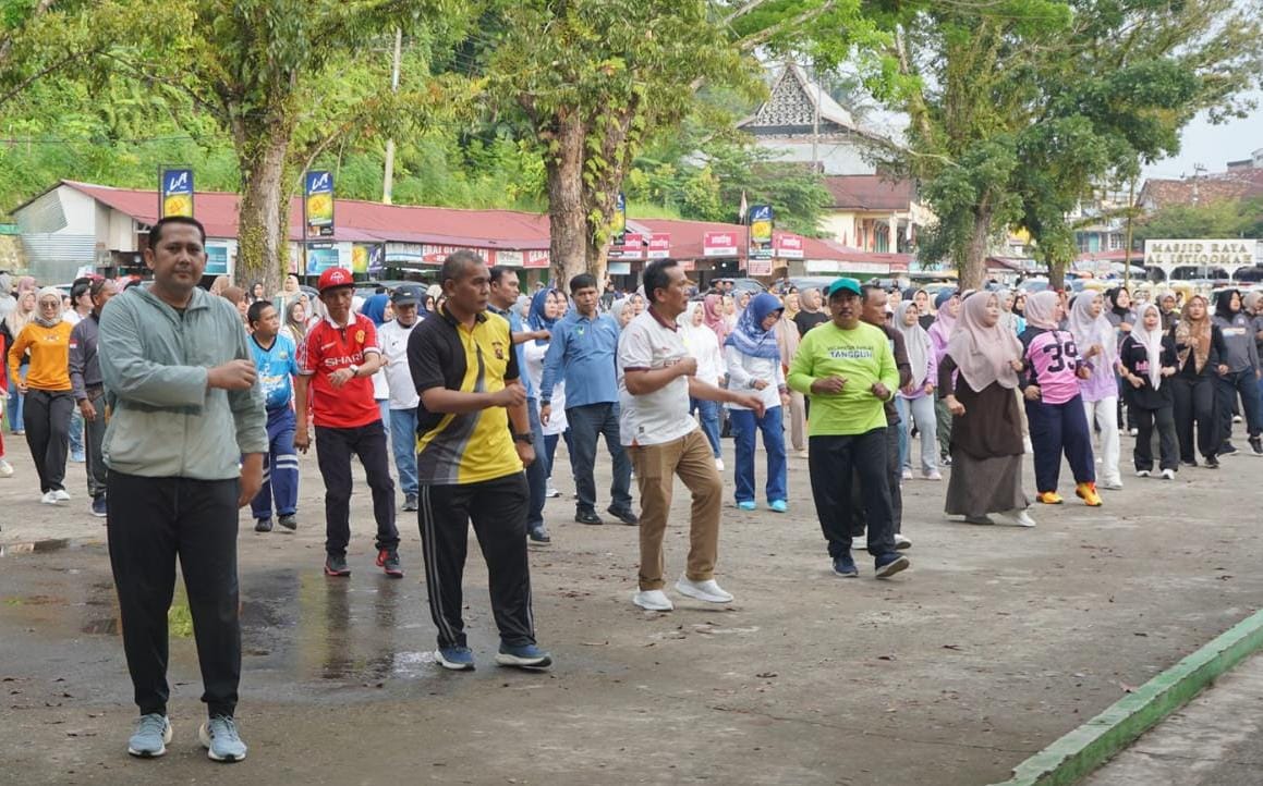 Bangko-Bupati Merangin H M Syukur bersama Asisten I Setda Merangin M Sayoeti dan sejumlah kepala Organisasi Peragkat Daerah (OPD), memimpin jalannya Senam Jumat Sehat, di Ruang Terbuka Hijau (RTH) Pasar Bawah Bangko, Jumat (01/8).