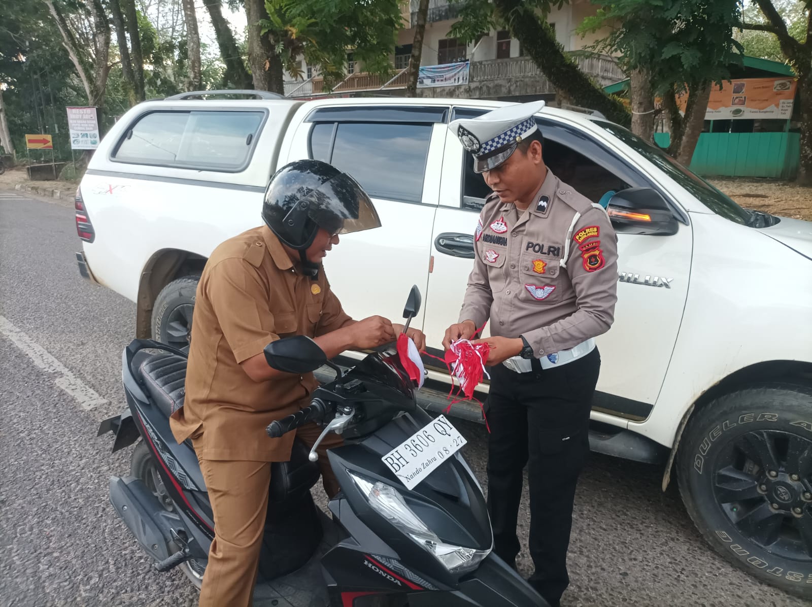 Didampingi oleh KBO Lantas Ipda Benhard Pandiangan. SH, serta jajaran personel Satlantas, Satuan Lalu Lintas membagikan puluhan bendera merah putih yang langsung dipasang pada kendaraan roda dua (R2), roda empat (R4), dan truk roda sepuluh (R10) angkutan barang.