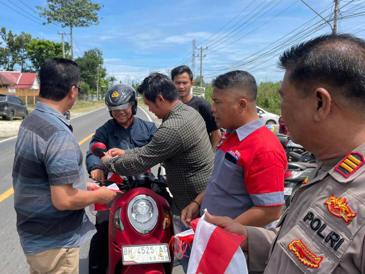 Satuan Intelkam (Sat Intel) Polres Sarolangun membagikan bendera merah putih kepada pengendera dalam rangka menyambut Dirgahayu Kemerdekaan Indonesia (RI) ke-80 Tahun 2025.