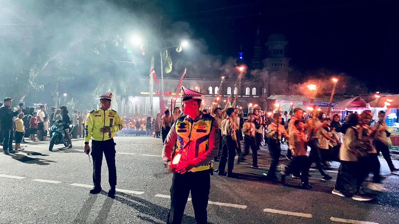 Sarolangun, Dalam rangka memberikan keamanan dan ketertiban pelaksanaan Pawai Obor memperingati HUT RI ke-80 tahun 2025 di Kabupaten Sarolangun, jajaran Polres Sarolangun lakukan Pengamanan dan Pengawalan. Sabtu 16/8/2025 malam