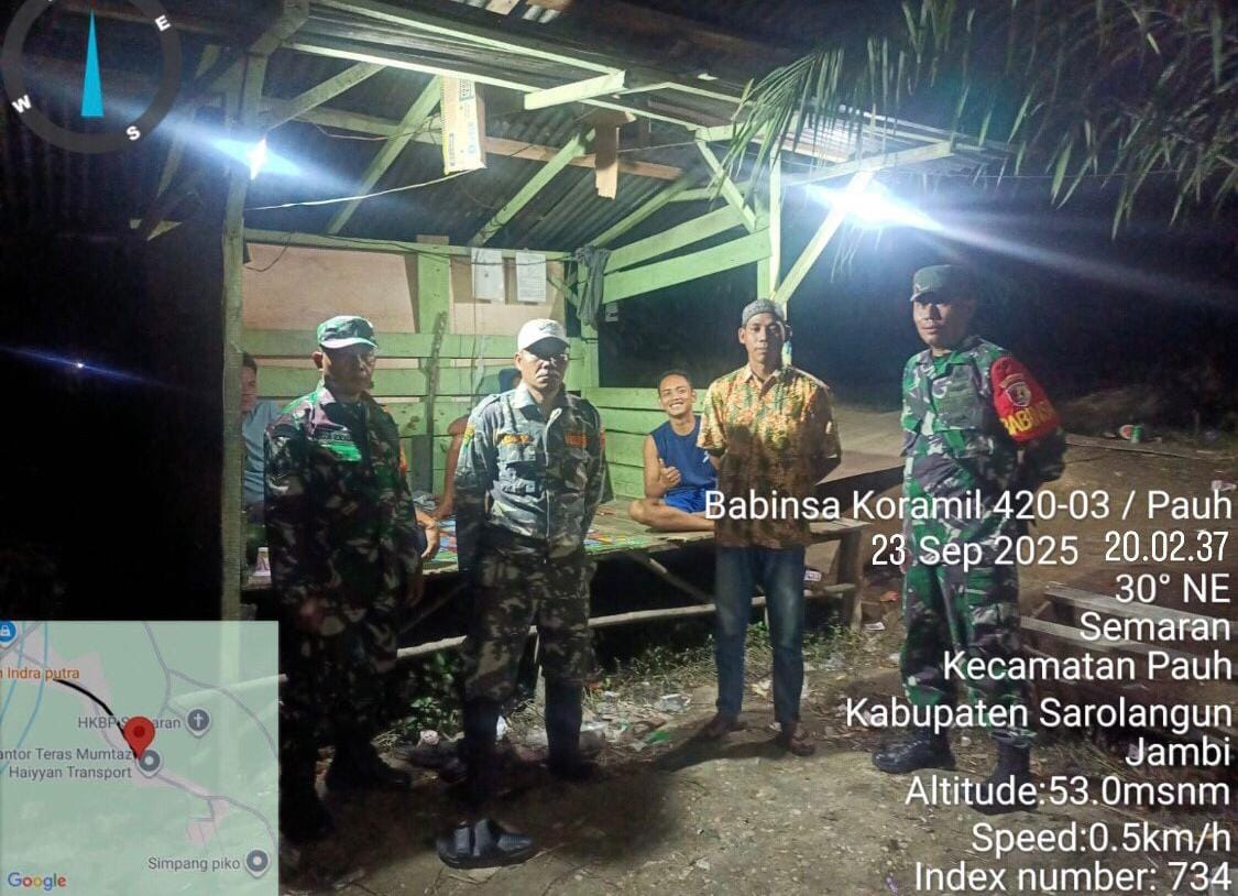 Sarolangun, 23 September 2025 — Dalam rangka menjaga keamanan dan ketertiban lingkungan, Koramil 420-03/Pauh melaksanakan kegiatan Patroli dan Komunikasi Sosial (Komsos) pada malam hari, tepatnya pada Selasa, 23 September 2025 mulai pukul 20.00 WIB hingga selesai.