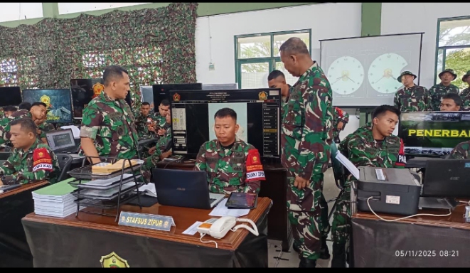Dinastinews.com Natuna —Komandan Pusat Simulasi Tempur (Pussimpur) Kodiklatad, Kolonel Inf Trijoko Adiwiyono, S.H., M.Si, meninjau langsung penggunaan Aplikasi Simpur Holomatrix pada Latihan Posko I (Latposko I) dalam rangka mendukung digitalisasi latihan di Batalyon Komposit 1/Gardapati, Kodam XIX/Tuanku Tambusai, Natuna, Kepulauan Riau, Rabu (05/11/2025).