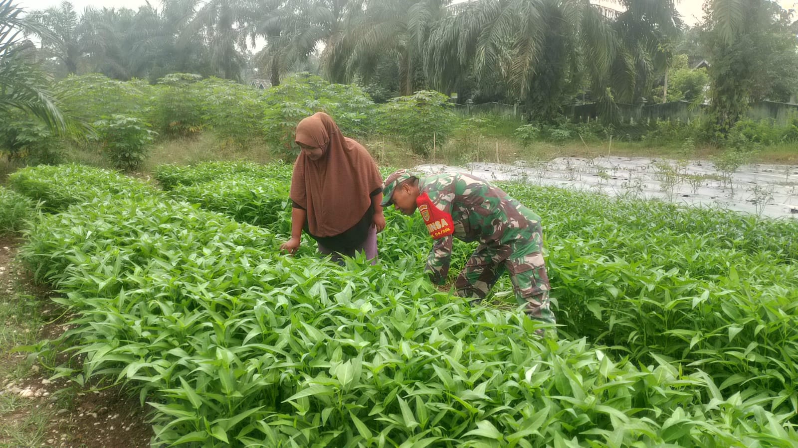 Babinsa Koramil 420-04/Sarolangun Kodim 0420/Sarko Serka Deni Riadi melaksanakan pendampingan ketahanan pangan melalui membantu petani merawat dan membersihkan gulma pada tanaman sayuran jenis kangkung, di Desa Pulau Melako, Kecamatan. Bathtin VIII, Kabupaten. Sarolangun.(15/12/2025)