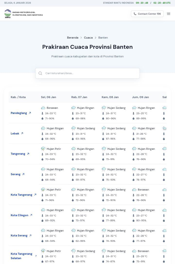 “Memasuki siang hari, cuaca diprakirakan cerah berawan hingga berawan, dengan potensi hujan sedang di wilayah Cibeber, Sobang, Cigembong, dan Lebakgedong. Sementara hujan ringan berpeluang terjadi di Cikeusik, Munjul, Pandeglang, Mekarjaya, Koroncong, Malingping, Panggarangan, Bayah, Cipanas, Muncang, Leuwidamar, Bojongmanik, Gunungkencana, Banjarsari, Cileles, Cimarga, Sajira, Maja, Rangkasbitung, Warunggunung, Cijaku, Cikulur, Cibadak, Cilograng, Wanasalam, Curug Bitung, Cihara, Cirinten, Cikande, Petir, Tunjung Teja, Cikeusal, Pamarayan, Kopo, Jawilan, Bandung, Balaraja, Cisoka, Tigaraksa, Panongan, Jambe, Jayanti, Cikupa, Pasarkemis, Curug, Tangerang, Pagedangan, Cisauk, Ciputat, Serpong, Pamulang, dan Pondok Aren,” jelas Meryadi.