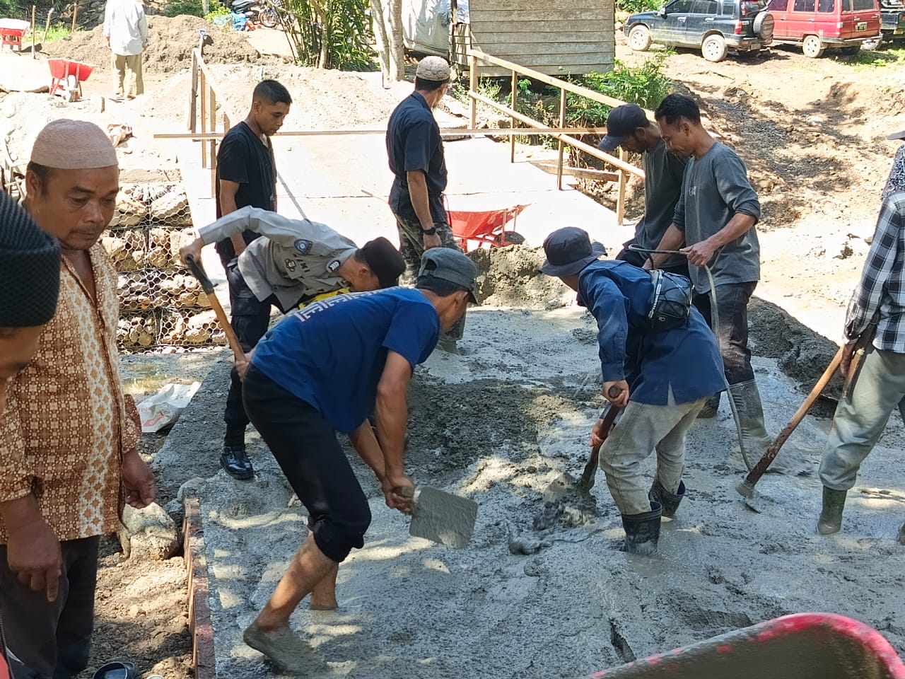 DinastNews.com | Aceh Tengah , Aparat kepolisian dari Polsubsektor Rusip Antara Polres Aceh Tengah bersama masyarakat mempercepat pemulihan akses antar kampung melalui kegiatan gotong royong pengecoran lantai jembatan darurat di Kecamatan Rusip Antara, Kabupaten Aceh Tengah, Minggu (19/4/2026).